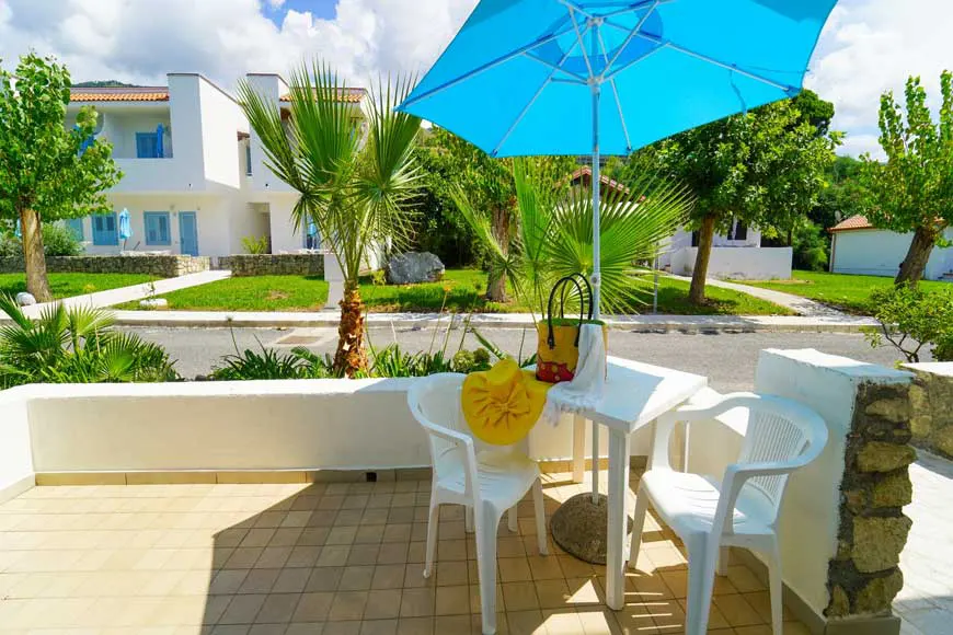- Bilocale (mq35): (4 posti letto) 2 ambienti, soggiorno con angolo cottura e letto a castello, camera matrimoniale, possono essere al primo piano con terrazzino o a piano terra con patio, entrambi gli esterni sono dotati di tavolo, sedie, stendibiancheria e ombrellone (collocati nel 1° o 2° viale).